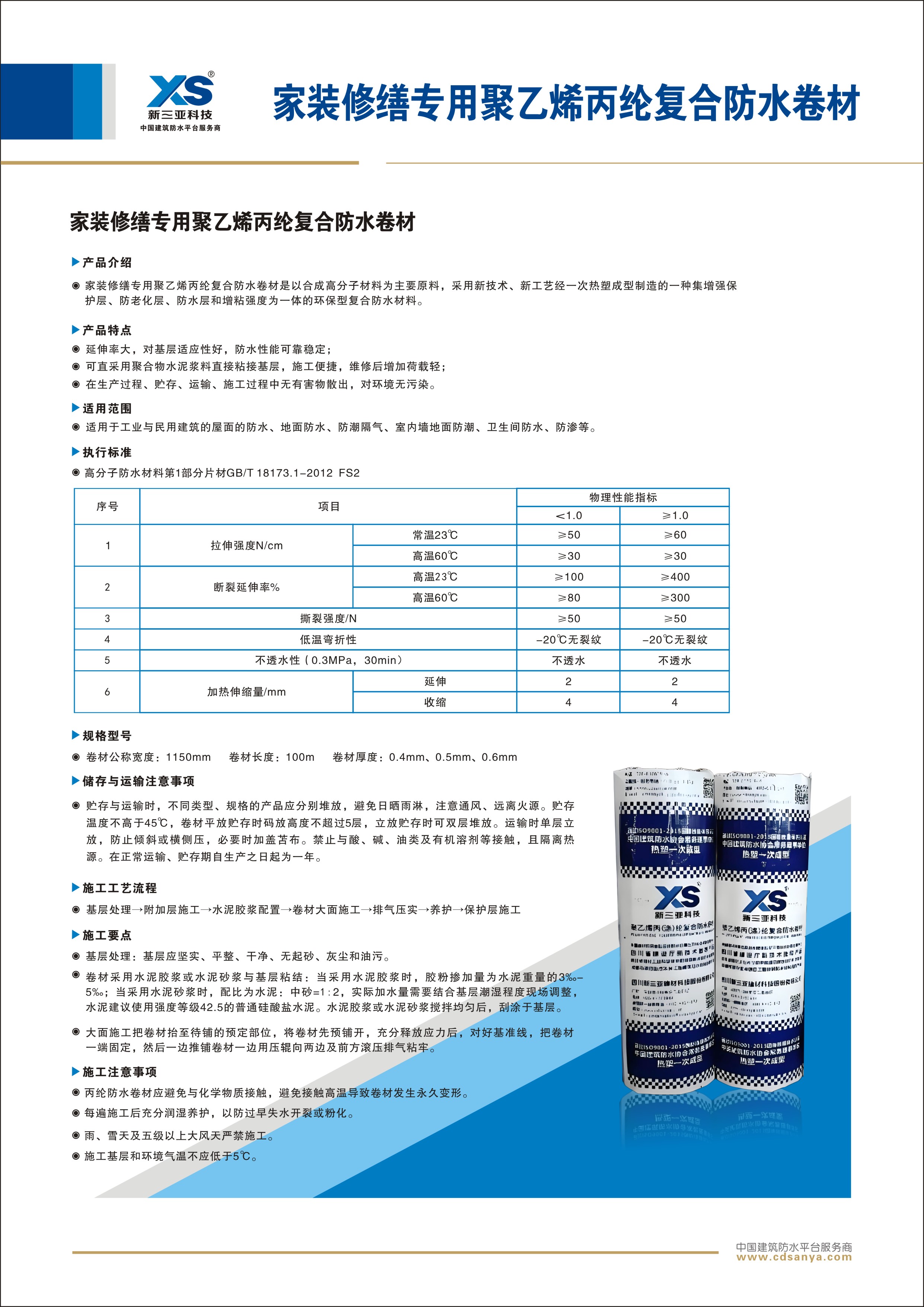 產(chǎn)品簡(jiǎn)介: 乙烯丙綸復(fù)合防水卷材是以合成高分子材料為主要原料,采用新技術(shù)、新工藝經(jīng)一次熱塑成型制造的一種集增強(qiáng)保護(hù)層、防老化層、防水層和增粘強(qiáng)度為一體的環(huán)保型復(fù)合防水材料。 規(guī)格: FS2-PE-0.5mm 1.15m×100m | ![]() | ![]() |